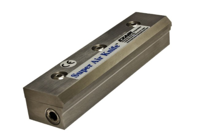 EXAIR 一直致力於提供強大的非接觸式產品清潔、乾燥和冷卻解決方案。對於此應用,我推薦 110218SS 型號的超級風刀套件。該套件包含一把 18 吋(457 毫米)303 不鏽鋼超級風刀、一個過濾器、一個調節器和一個墊片組。不銹鋼結構可有效抵禦製程中使用的刺激性清潔劑。如果需要額外保護,EXAIR 還提供 316 不銹鋼材質。超級氣刀的獨特之處在於它以 40:1 的比例吸入環境空氣,僅用少量壓縮空氣即可產生強大的衝擊力。此外,過濾器還可以捕獲壓縮空氣管路中的任何污染物,以保持表面清潔。調節器和墊片組用於控制清除碎屑所需的力道。