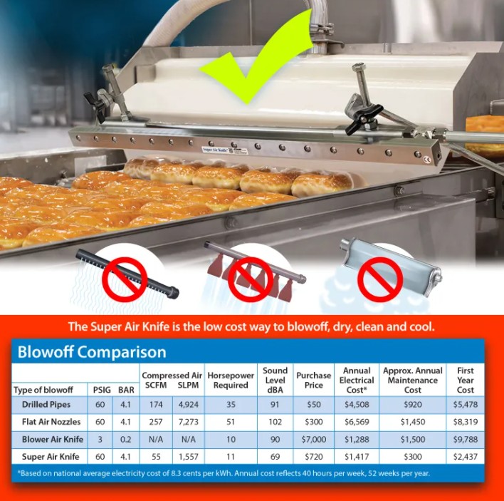 EXAIR的超級風刀是多種工業吹除應用中理想且免維護的解決方案。領先業界的超級風刀在壓縮空氣耗氣量與噪音方面,與其他吹除方式相比可大幅降低。超級風刀提供從3英吋到108英吋的各種長度,並有鋁合金、303 不鏽鋼、316 不鏽鋼,以及適用於腐蝕性環境的 PVDF材質可選。即便在80psig的高壓下,大多數應用中其噪音也僅為69dBA!超級風刀能以40:1的放大倍率從周圍環境中引入空氣,最大化其吹力與流量。此外,這些風刀也符合或高於OSHA的最大終端壓力與噪音規範。