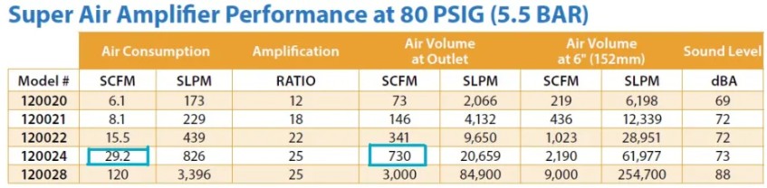 超級空氣放大器排氣端的出氣總量為730 SCFM,扣除壓縮空氣消耗量29.2 SCFM,表示它大約吸入了700 SCFM的空氣。這個表現已經不錯了。