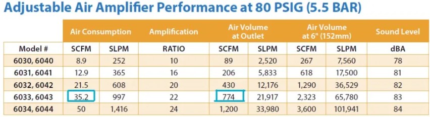 而可調式空氣放大器的排氣端的出氣總量為774 SCFM,扣除同樣的壓縮空氣消耗量29.2 SCFM,則代表其吸入量約為740 SCFM。這就更好了。