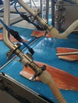 2014年,這家加工廠購買了兩台1.5英寸316不鏽鋼管式輸送器(型號6063-316),用於收集從鮭魚片中去除的魚刺。管式輸送器安裝在「去骨」滾輪的後方。橫跨鮭魚片的吸盤安裝在管式輸送器的真空端。他們非常喜歡這款產品無需任何活動元件的工作原理,以及其堅固耐用的特點,因為他們使用這項產品已經6年多了。但他們需要提高魚類的產量,因此需要更高的輸送速率來收集去除魚刺。他們給我發了一張他們目前製程的照片。