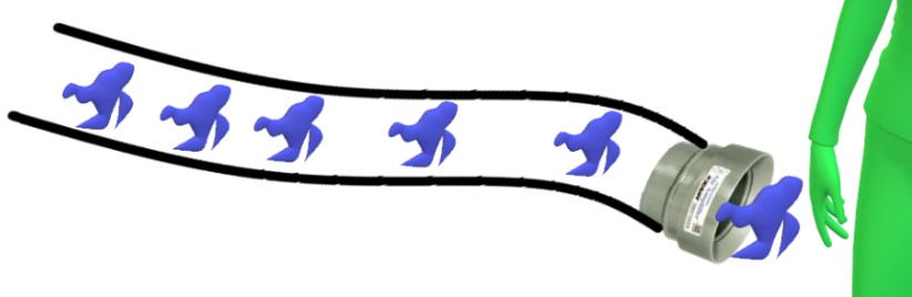 下圖是此方案的示意圖。型號6043空氣放大器的出風口連接著一條內徑3英吋的軟管,可以將透明包裝袋吹送到15英尺遠的垃圾收集處。操作員(圖中綠色標示)只需將透明包裝袋靠近吸入口即可,其餘的工作由空氣放大器完成。